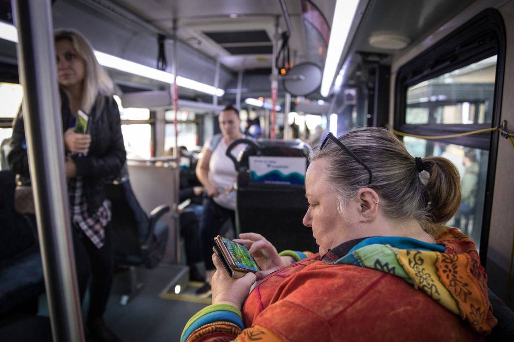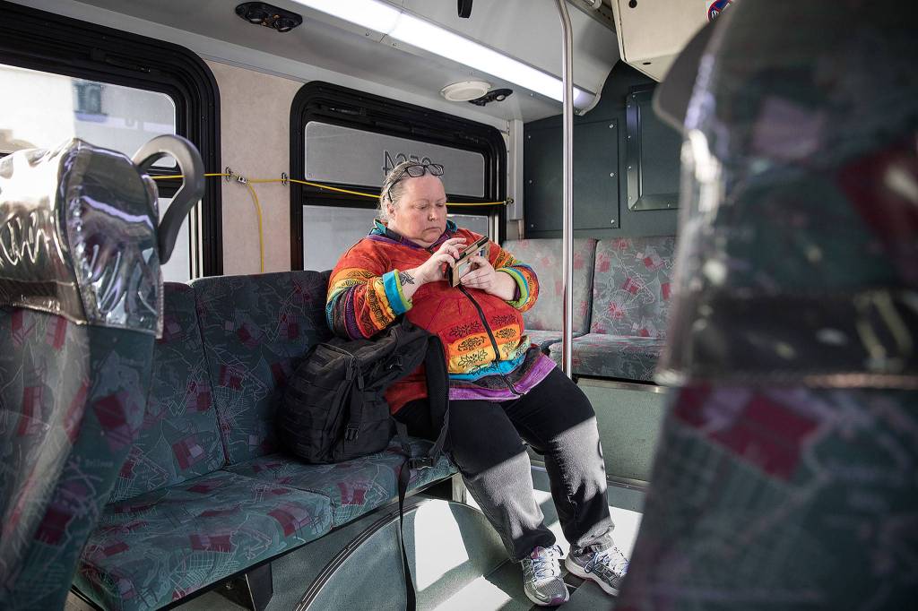 Burks passes the time on the buses playing games and sleeping. She’s looked for work in Snohomish County.