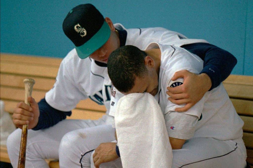 Alex Rodriguez (left) comforts teammate Joey Cora after the Mariners were eliminated bu the Indians in the American League Championship Series on Oct. 17, 1995, in Seattle. (AP Photo/Jack Smith)