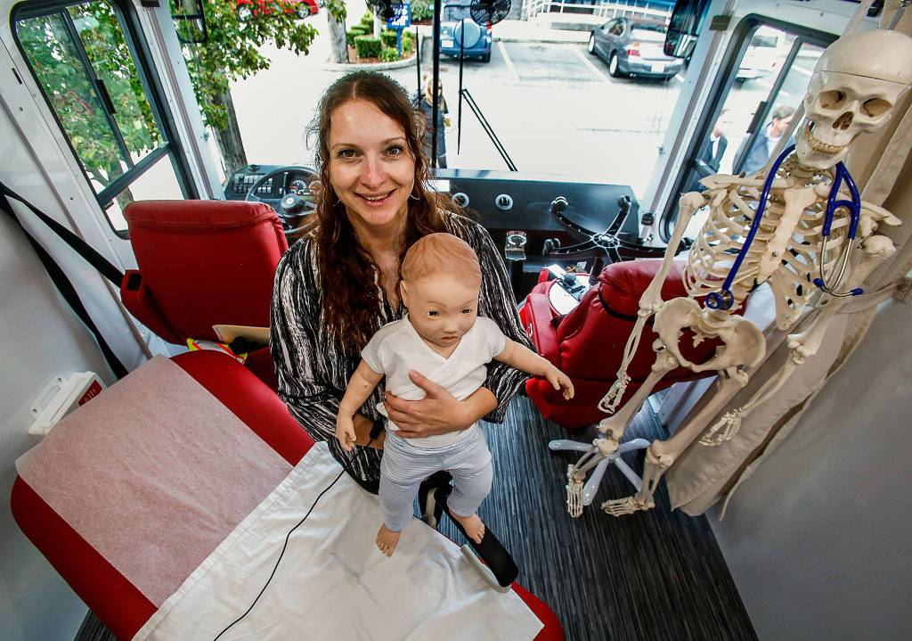 The vehicle is not yet providing services, but visitors Thursday had a chance to peek inside and see on exam tables two high-fidelity mannequins, one toddler-sized and the other an adult figure. Carrie Brood, a simulation education specialist with WSU’s medical school, said the mannequins are used in training to mimic patient care.