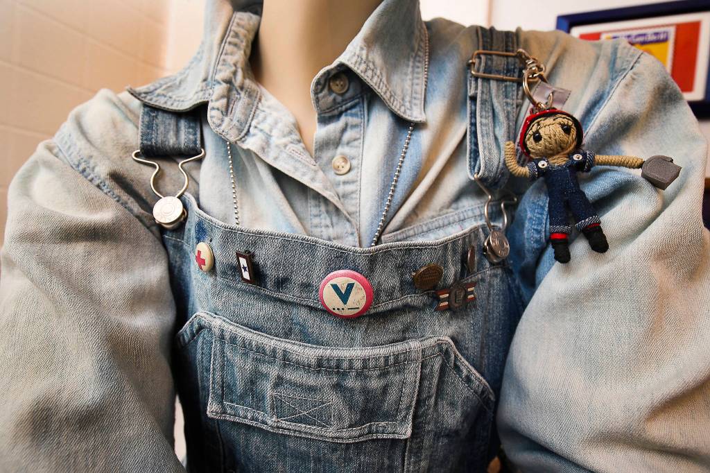 Hanson’s Rosie even has all of the pins shown on Rosie the Riveter’s overalls, as Christmas gifts from her son Dennis Hanson.