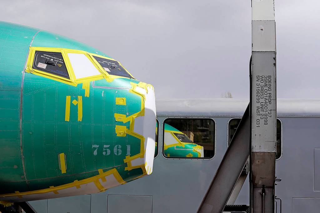 This April 9 photo shows the front of a Boeing 737 fuselage, eventually bound for Boeing’s production facility in Renton, sits on a flatcar rail car and is reflected in a nearby passenger train car at a rail yard in Seattle. (AP Photo/Elaine Thompson, File)