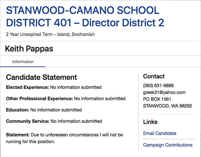 His statement on the voter’s pamphlet, which was mailed out to those in the district, reads “Due to unforeseen circumstances I will not be running for this position.”