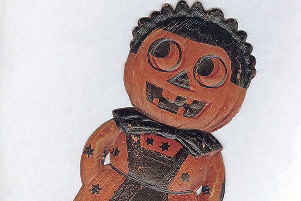 This jack-o’-lantern is dressed like a maid with a black apron and curly hair. She is an 8-inch-tall German cardboard figure made in the 1920s that sold for $90 in a Ruby Lane store.