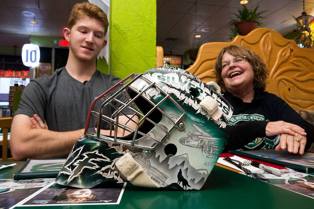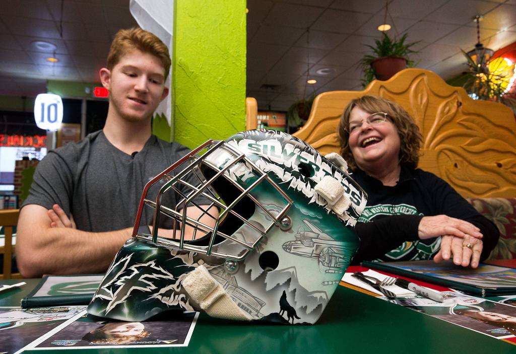 Wilds, a Silvertips season-ticket holder, was the grand-prize winner of a contest held by the Silvertips to help design Dustin Wolf’s goalie mask. She sketched out the mean wolf head that was painted front and center on the top of Wolf’s mask. For her efforts, she earned a recent lunch meet-and-greet with Wolf at El Paraiso Mexican Grill in Everett.