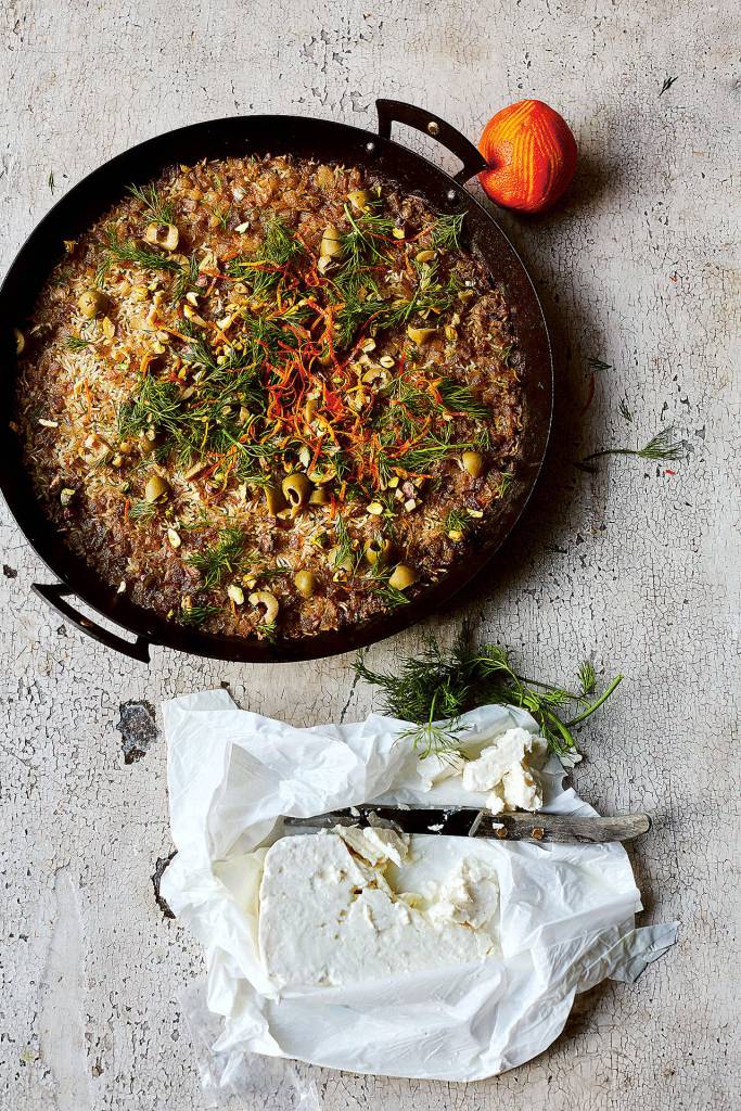 Scatter the orange zest, feta and dill over the top, drizzle with olive oil, and serve. You will find that the rice has formed a delicious crust on the bottom of the pan. Serves 8.