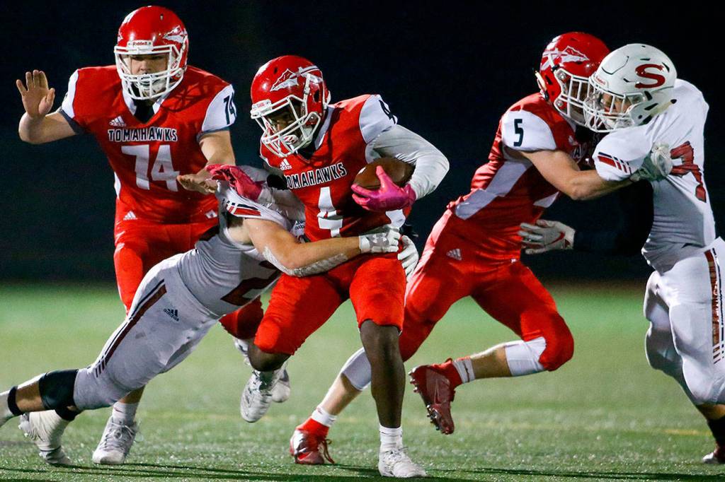 The Wesco 3A North champion Tomahawks (9-0) cruised to a 35-0 second-quarter lead and held Wesco 3A South champion Snohomish to just 119 yards of total offense.