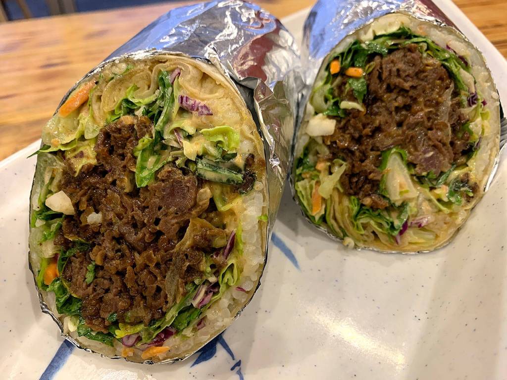 The “Bulgoritto” is a flour tortilla filled with bulgogi (sweet Korean barbecue beef), cilantro, basil, salad greens and rice, with spicy mayo and chile lime dressing.