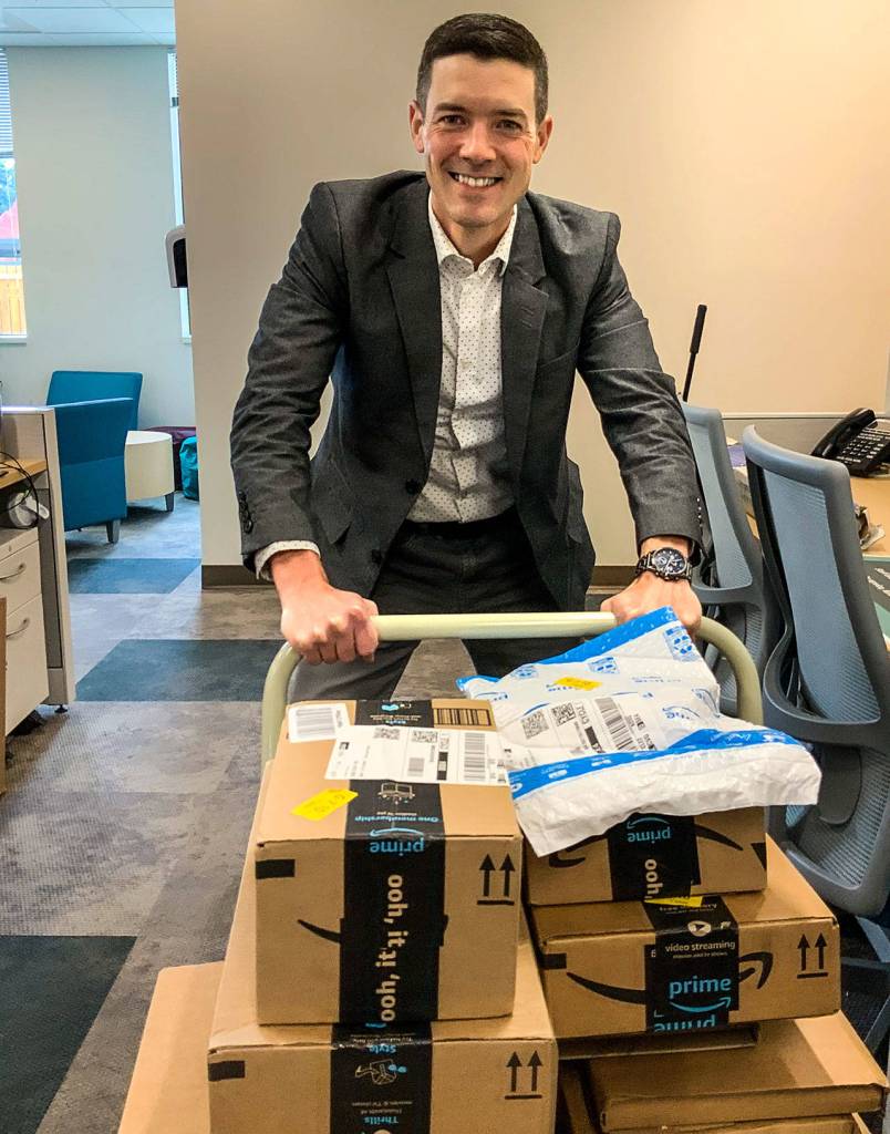 Joseph Alonzo, CEO of Cocoon House, moves a cart load of new books arriving from Amazon. In celebration of its 125th anniversary, the Everett Woman’s Book Club has donated more than $3,000 in new books to the agency that serves homeless teens and young adults. (Photo courtesy Woman’s Book Club of Everett)