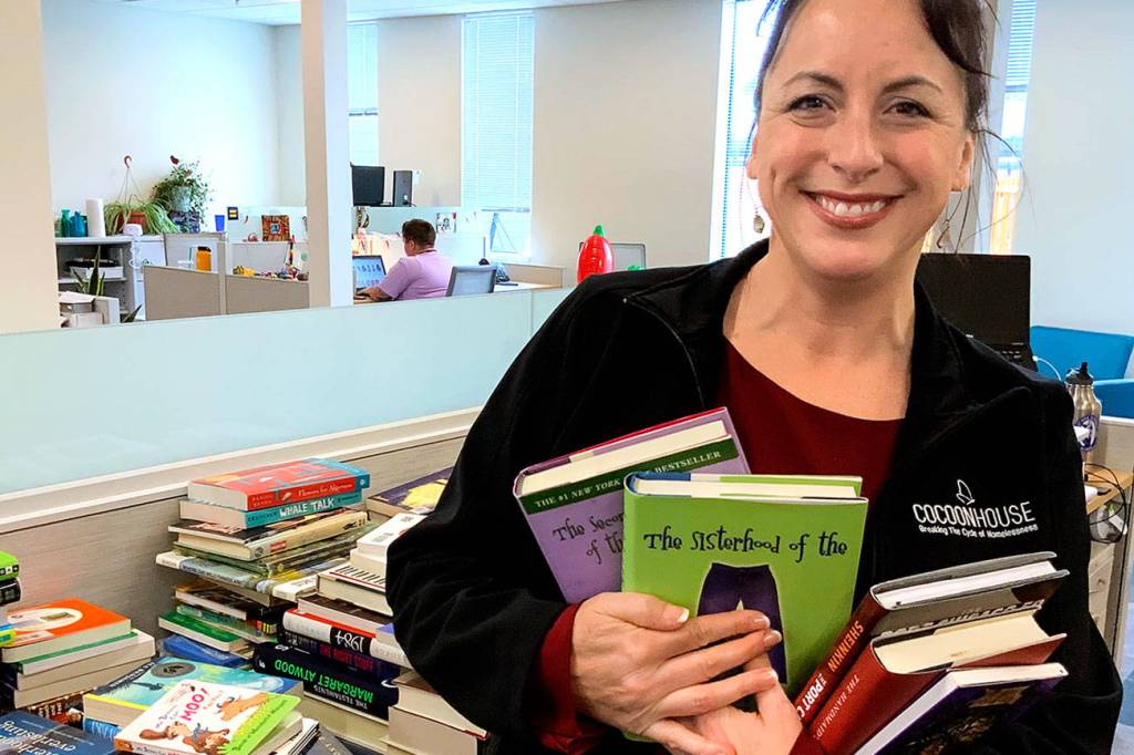 photos from Woman’s Book Club of Everett                                Becky Whitefield, marketing coordinator at Cocoon House, shows off some of the gift books. In celebration of its 125th anniversary, the Everett Woman’s Book Club has donated more than $3,000 worth of new books to the agency that shelters homeless teens and young adults.