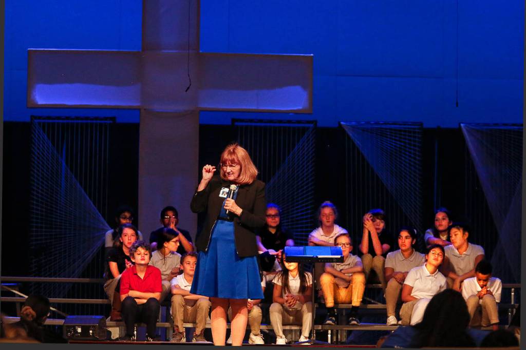 “Rejoice, rejoice … Can you feel a brand new day?” sang a sixth-grade choir during the gathering of students, teachers and parents in the spacious sanctuary the school shares with Northshore Christian Church.