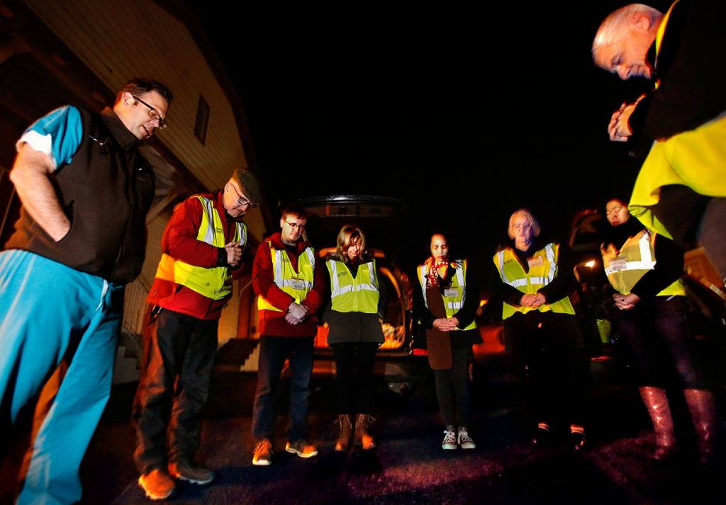 Instead of a cleric’s vestments, Kelly wore a reflective yellow vest over his coat on that cold night in Everett. Meeting in a parking lot at Our Lady of Perpetual Help on Cedar Street, MercyWatch team members showed up, one by one.