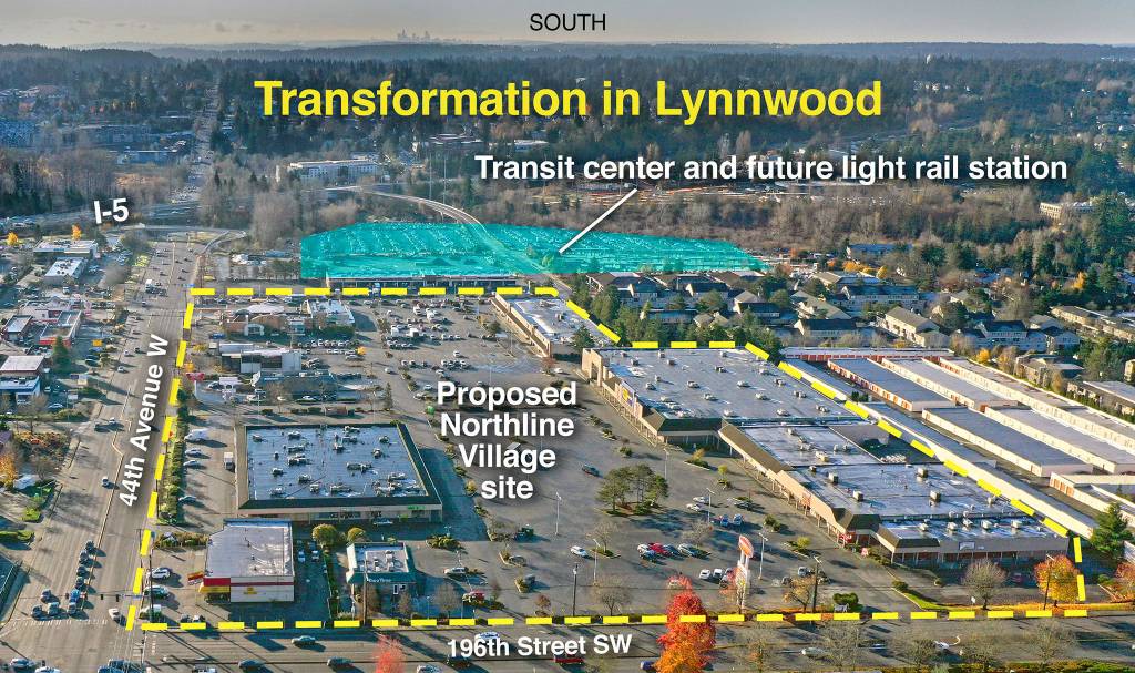 The project would bring 1,370 housing units, seven-story office buildings, 170,000 square feet of retail space and 4,700 parking spots — all just a block away from the Lynnwood Link light rail station.