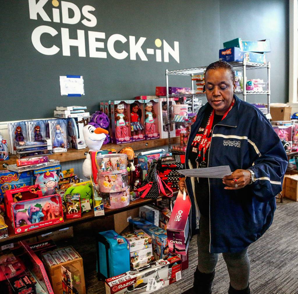 “As you look around here, you can see — this community is so incredibly gracious to us. We have 85 businesses collecting for us,” said Butler, 62, the area coordinator for Toys for Tots in Snohomish County.