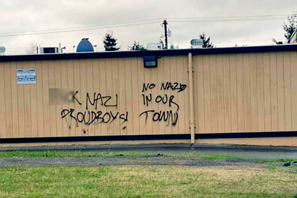 Prior to the posting, sometime Thursday night or Friday morning, the bar had been tagged with at least three messages. Photos show graffiti saying “NO NAZIS IN OUR TOWN” and “(Expletive) NAZI PROUDBOYS!”