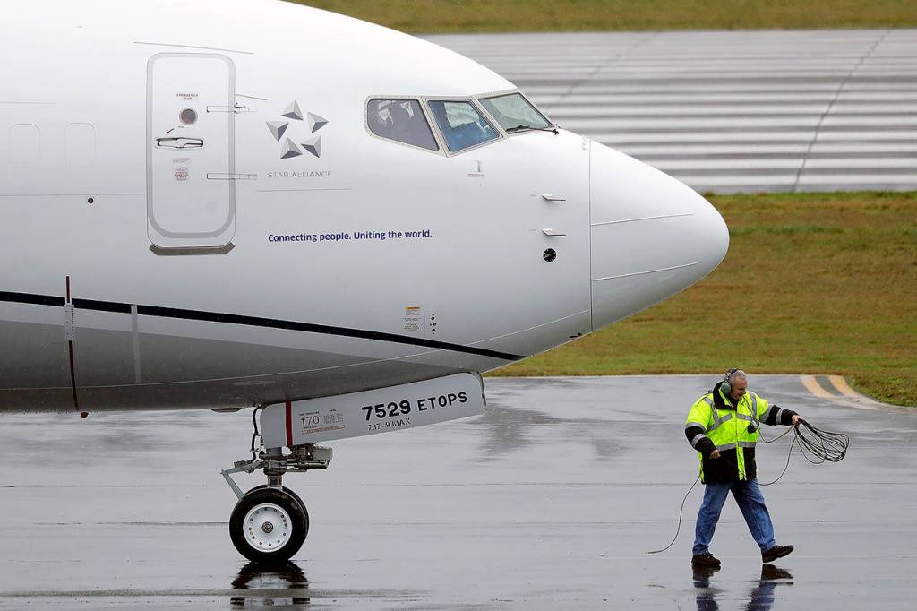 An undelivered United Airlines Boeing 737 Max airplane prepares to take off Dec. 11 at Renton Municipal Airport. (AP Photo/Ted S. Warren)