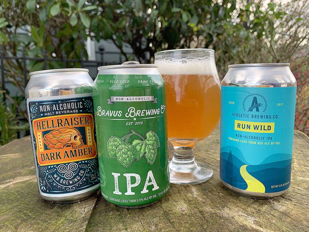More non-alcoholic craft beers have hit the market recently, including beer, from left to right, Missouri’s Wellbeing Brewing, California’s Bravus Brewing Co. and Connecticut’s Athletic Brewing. (Aaron Swaney)