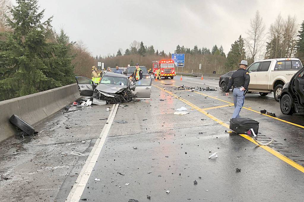 The collision happened just before 1 p.m. on the westbound lanes of the highway, between Highway 9 and Bickford Avenue. A Lake Stevens woman was westbound with a small child passenger when a sudden hail storm created slush on the roadway and their car lost traction and rotated to the left, according to the Washington State Patrol.