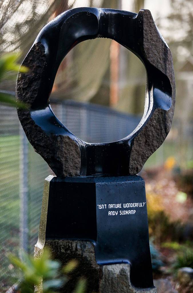 Andy Sudkamp’s favorite saying — “Isn’t nature wonderful?” — now has a place of honor in Evergreen Arboretum. A striking basalt sculpture stands as a lasting memorial to the outdoorsy Everett High School teacher who died in 2015 at the Grand Canyon.