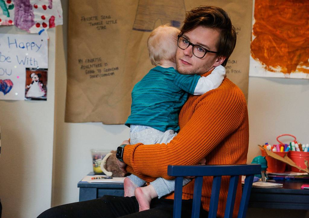German au pair Rico Baumgardt, 21, holds 1-year-old Owen Hertl affectionately. Their time together grows short as the au pair will soon leave his host family’s Edmonds home after a year’s stay. (Dan Bates / The Herald)