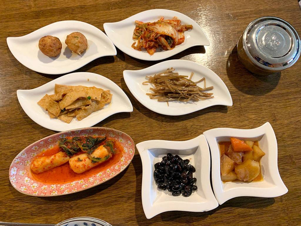 It didn’t matter — everything was delicious. Our favorites were takoyaki, a ball-shaped snack that’s a popular street food in Japan, fish cakes, and sweet potatoes and carrots drenched in house-made soy sauce; we later found out the array of side dishes are known as banchan in Korean cuisine.