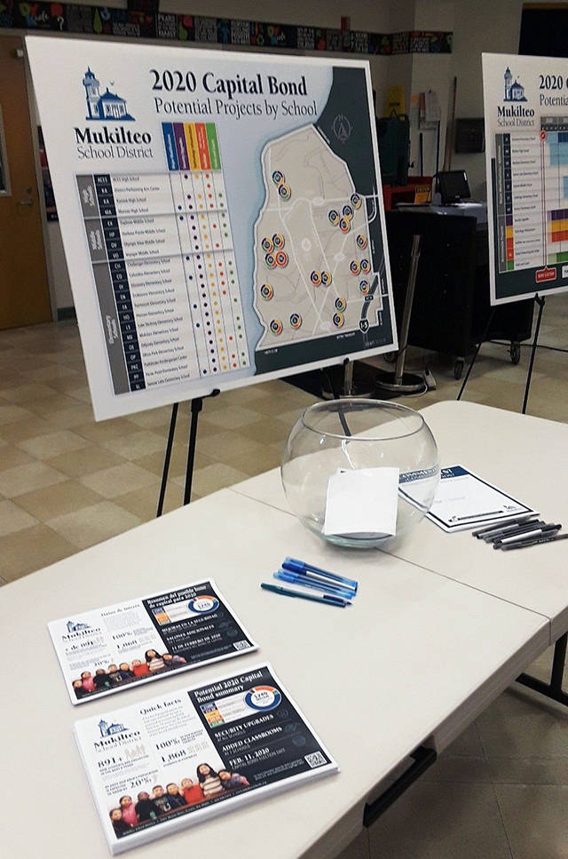 Posters and flyers await attendees at a community bond information night at Harbour Pointe Middle School in October. (Mukilteo School District)