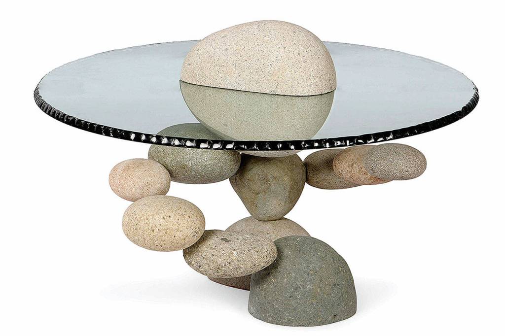 This table is 22 inches high with a round glass top 42 inches in diameter. Poking through the glass is a rock with its top 28 inches from the floor. He used old natural forms in a new unbalanced way, which is known as postmodernism. That is the name of an unusual period of art developed in the 1950s that fuses past styles with the look of modern magazines, films and other unexpected sources. But is this just a great table? Or is it art?