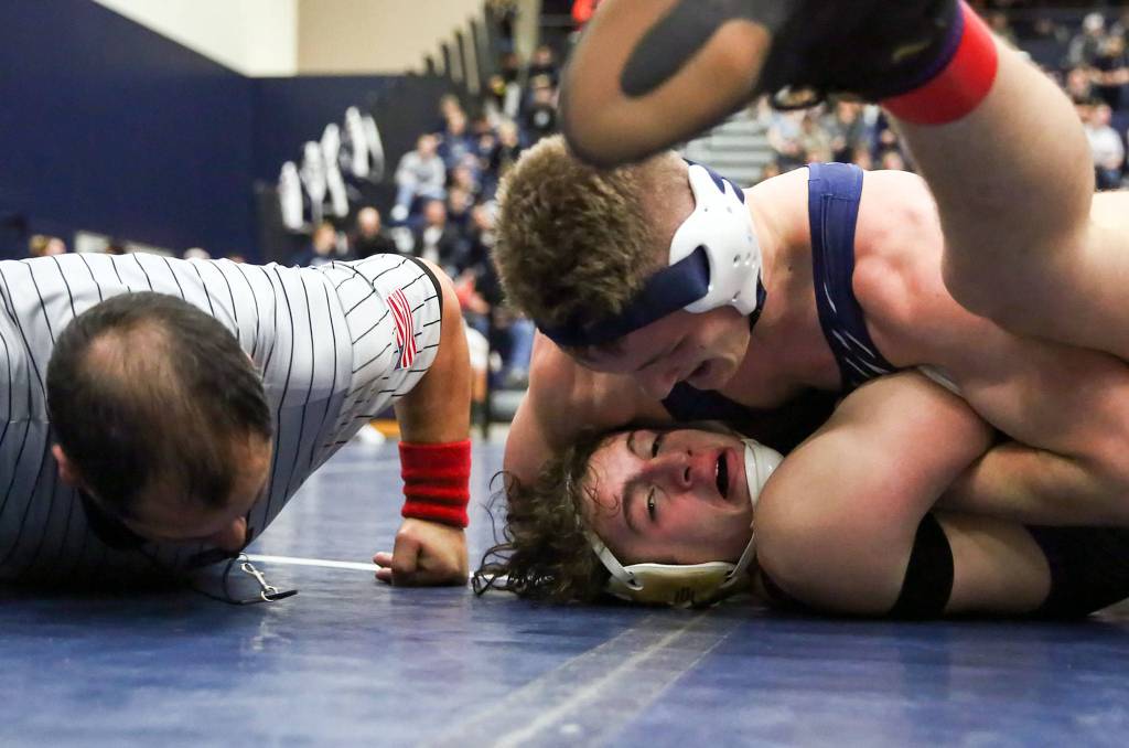 Wrestling full of confidence at his preferred weight of 170 pounds, Glacier Peak’s Dylan Owen thundered to a regional title, pinning all three of his opponents capped by a win over Lake Stevens’ Sean Sanchez in the finals 3 minutes into the bout.