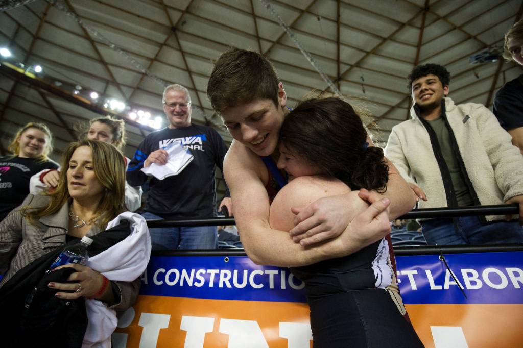 It was the second time this season that White had gotten the better of Tuifua, pinning her in 1:21 in the semifinals of the Everett Lady Classic on Dec. 14, before beating Lake Stevens’ Kiley Hubby — who also won a state championship Saturday night — 6-4 in the finals.
