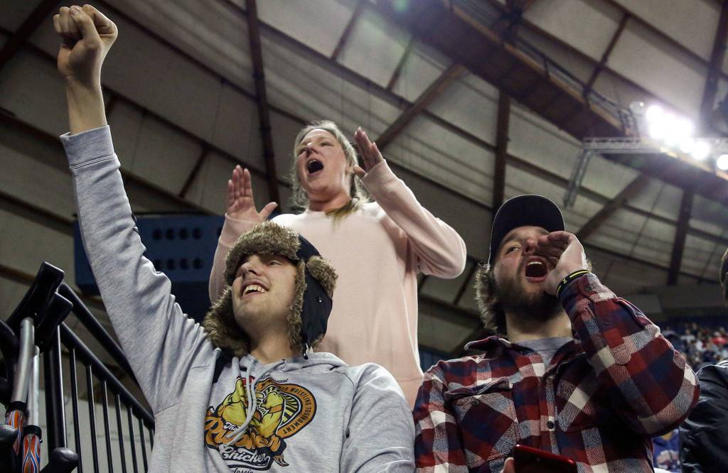 Tyler Deason (left) Maggie Deason and Anthony Hall cheer on Sultan’s Cody Deason during Mat Classic XXXII Friday at the Tacoma Dome on February 21, 2020. (Kevin Clark / The Herald)
