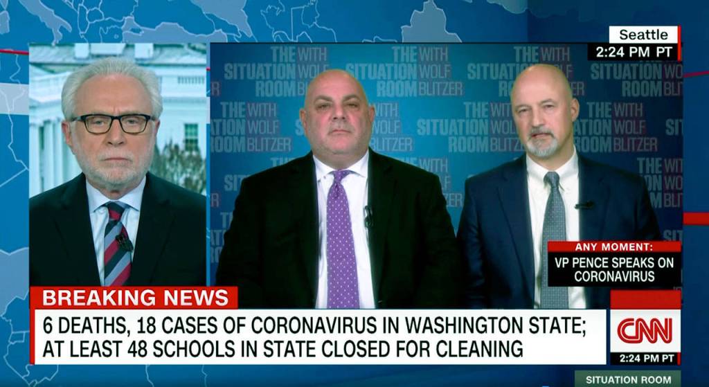 Everett Public Schools Superintendent Ian Saltzman (center) and Jackson High School principal Dave Peters (right) are interviewed by Wolf Blitzer on CNN on Monday. (CNN)