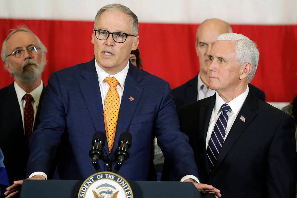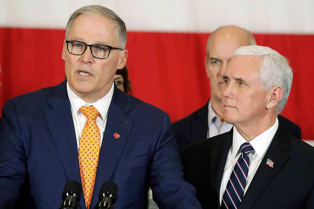 But a week later, when Pence made a trip to the state to meet with Inslee and other government leaders at the state’s emergency operations center at Camp Murray, there was no sign of friction between the two. Asked during a press conference about his tweet, Inslee said they were getting good science and expected a good partnership; Pence complimented Inslee for leading the state’s response.