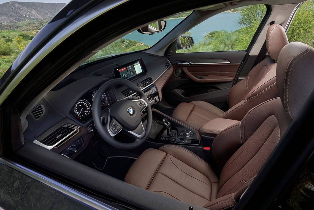 For 2020 the X1 is updated inside and out. A previously optional 8.8-inch display screen is now a standard feature of the infotainment system, which includes iDrive 6, navigation, and Apple CarPlay compatibility. The instrument panel and floor mats have decorative stitching, and the optional Dakota interior adds a color-matched lower dashboard and door handle surfaces. A new electronic gear selector operates the updated eight-speed automatic transmission.