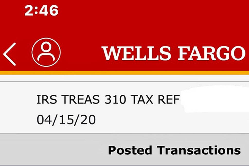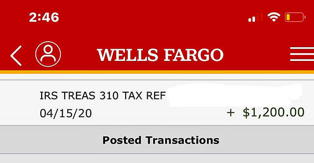 The proof of deposit for a lucky early recipient of the government’s $1,200 coronavirus stimulus payment. (Herald staff)