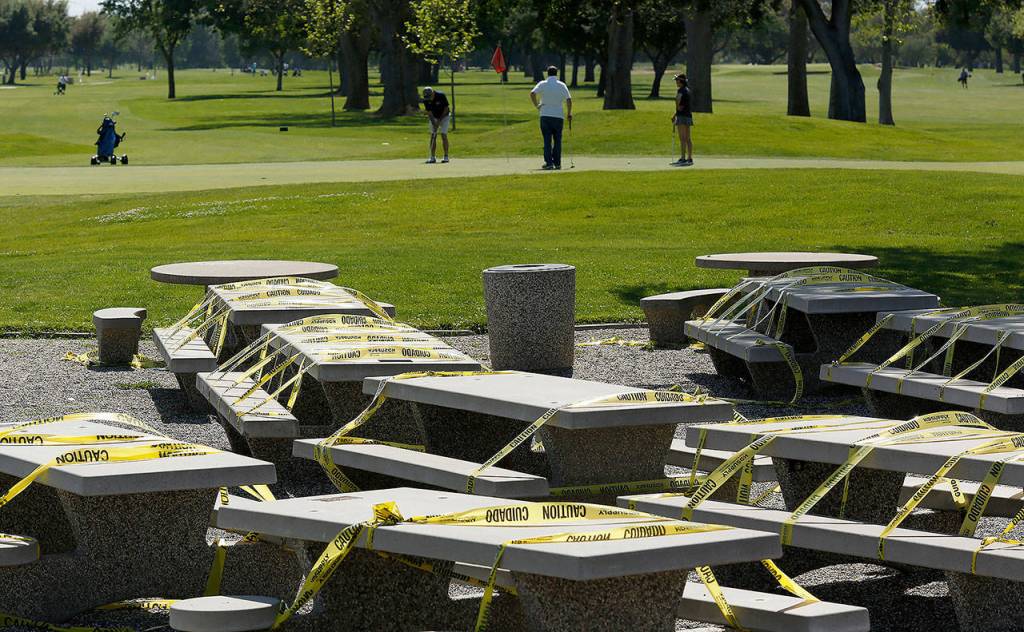 Yellow caution tape covers the tables to prevent their use at the Haggin Oaks Golf Complex in Sacramento, California on Tuesday. (AP Photo/Rich Pedroncelli)