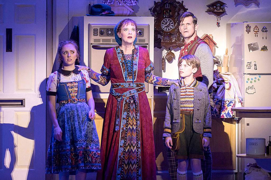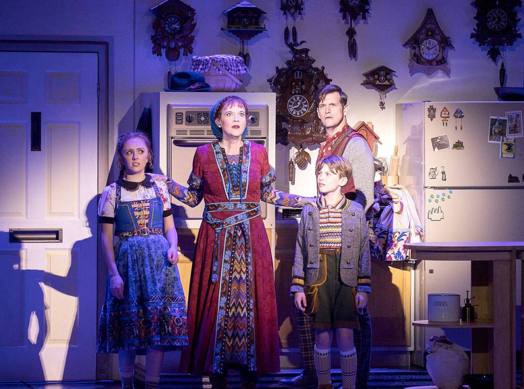 Isabella Corsaro (Heidi), Kate Jaeger (Gretl), Jonas Winburn (Günter) and Kevin Vortmann (Hansel) star in Village Theatre’s production of “Hansel & Gretl & Heidi & Günter.” (Mark Kitaoka / Village Theatre)