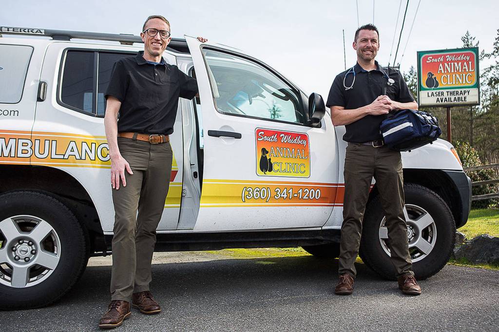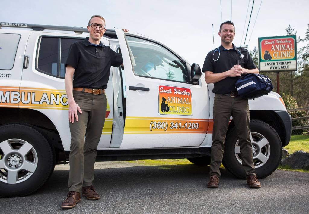 The SUV’s vinyl wrap has orange stripes with “Pet Ambulance” in big letters and blue medical emblems covering the side rear windows. It is parked at the ready in front of their South Whidbey Animal Clinic on Highway 525 across from Ken’s Korner shopping plaza in Clinton.