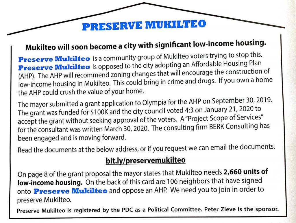 “Mukilteo will soon become a city with significant low-income housing,” the flyer headline states in bold letters.