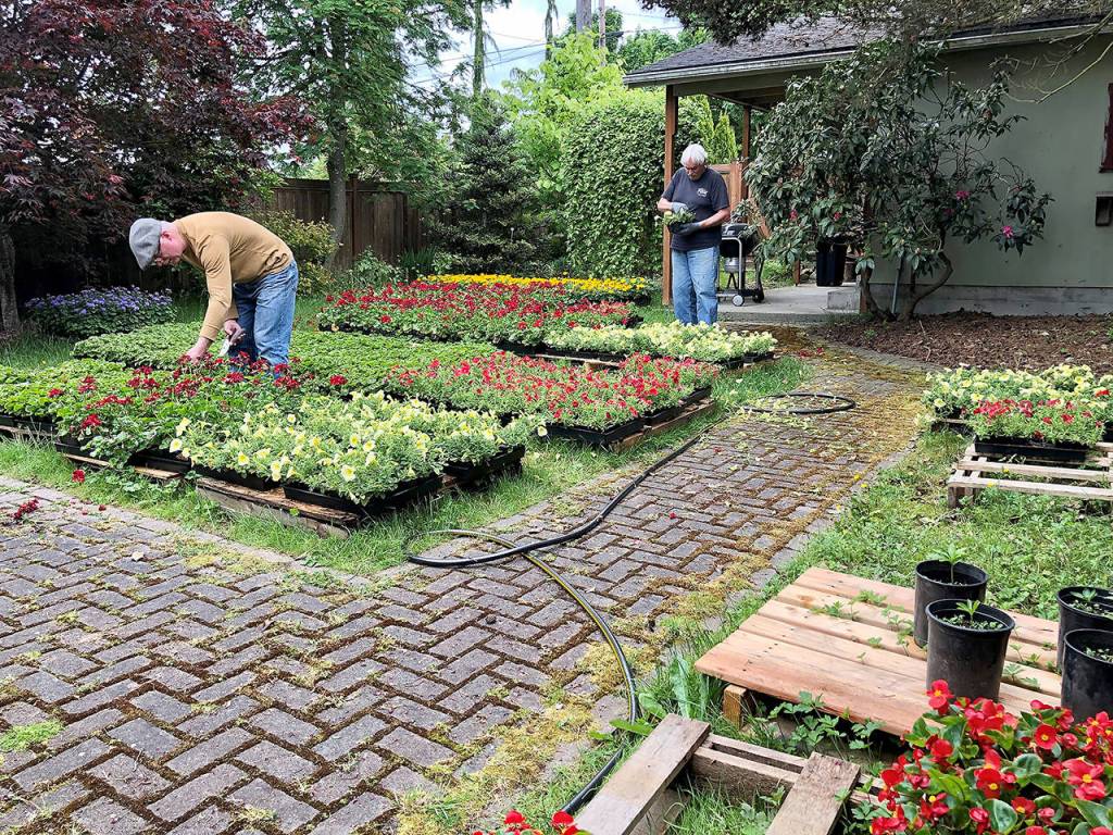 Patrick Hall (left) and Paul Popelka take care of flower plants purchased recently in an online auction. The blooms were to have been planted by the city of Everett, but due to budget cuts were sold to bidders. The Downtown Everett Association, helped by volunteers, will plant the flowers next weekend in the planters along Hewitt, Colby and Wetmore avenues. (Craig Skotdal photo)