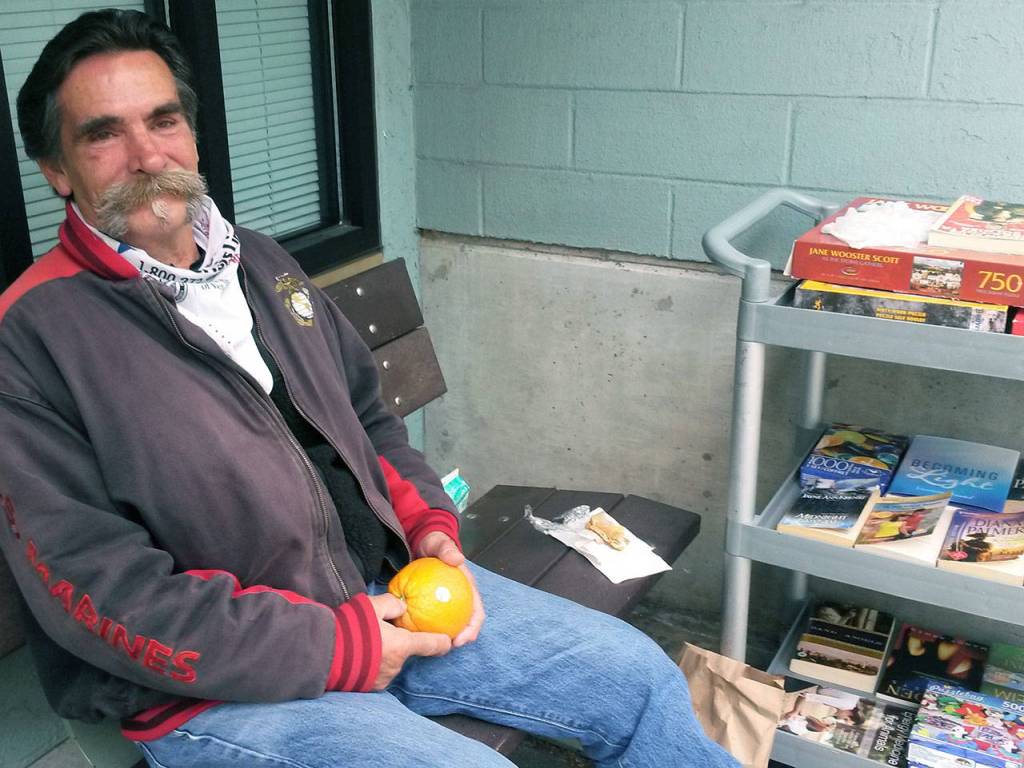 Outside each day, the 68-year-old Lanphere not only eats lunch, as a longtime senior center volunteer he hands out books and puzzles to those in need of stay-home diversions. The items come from the closed center’s collection. Clients don’t grab books off outdoor shelves. Instead, once they choose, Lanphere wears protective gloves to give out a book, puzzle or game.