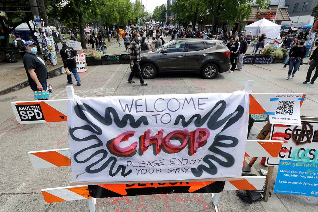 A sign reads “Welcome to CHOP,” on Sunday inside what has been named the Capitol Hill Occupied Protest zone in Seattle. The name is a change from CHAZ (Capitol Hill Autonomous Zone) that was used earlier in the week. (AP Photo/Ted S. Warren)