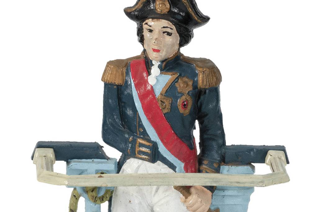 Eldred’s Auctions sold an unusual umbrella stand recently. It was cast iron, a platform topped by two griffins holding a higher platform with anchors and a 4-foot-high statue of a man in military uniform. He had a folded jacket sleeve in place of his right arm, shoulder epaulets, medals and a tricorne hat suggesting a high-ranking naval hero.