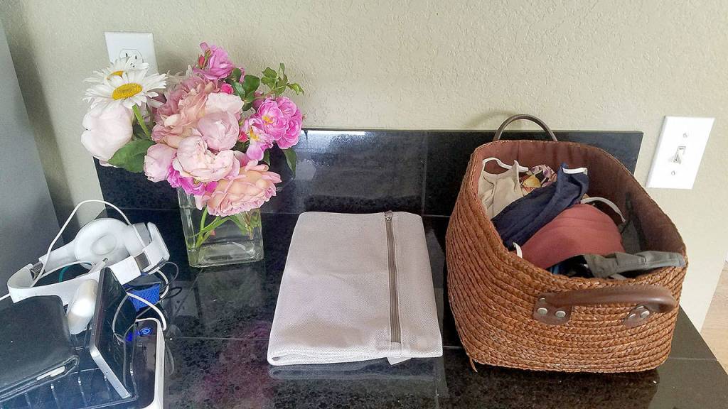 Washing: I keep a lingerie bag (a mesh bag for washing delicates) next to the basket. Used masks go into the bag. When it’s semi-full, I wash the bag in our machine on warm, by itself. I use a fragrance-free detergent because I don’t want my family to breathe in perfumes.