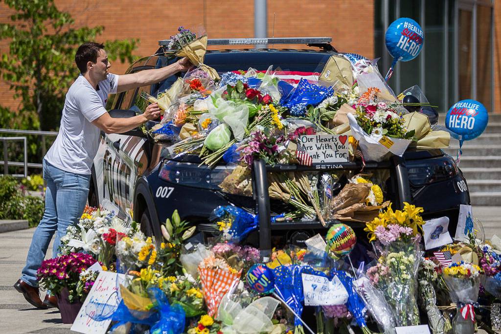 The city mourned Shoop with a memorial outside city hall. He’s the only Bothell police officer ever killed in the line of duty. People covered a patrol car in flowers, flags, balloons and messages of thanks to Shoop and his family.