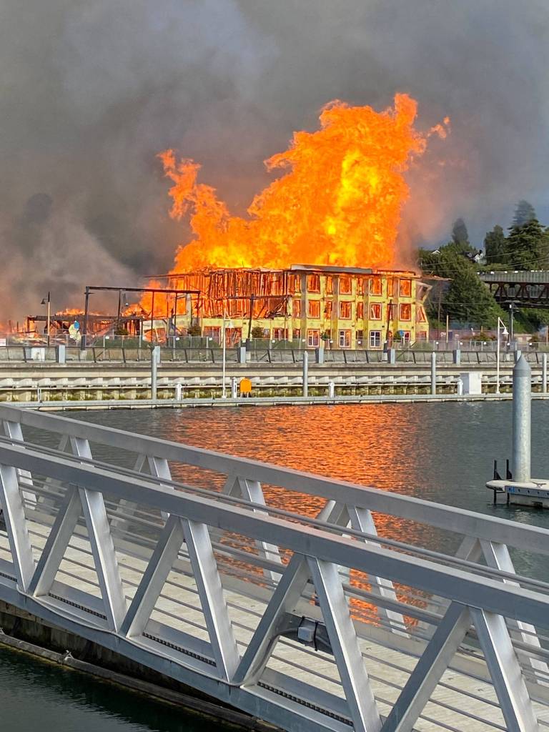 Flames engulfed a building that’s part of the unfinished Waterfront Place Apartments, at 1300 West Marine View Drive. The apartments were set to become the first major residential complex on the Everett waterfront, with 266 units in two buildings. About half of the construction project was destroyed Thursday.