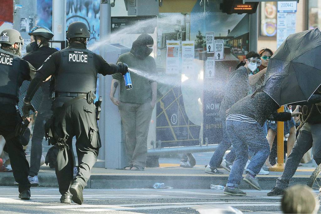 Police pepper-spray protesters Saturday near Seattle Central College in the Capitol Hill neighborhood. (AP Photo/Ted S. Warren)