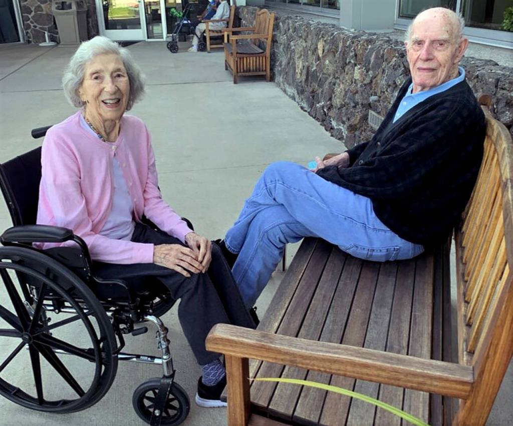 Julie Muhlstein’s parents, Jeanne Ahrens, 98, and Richard Ahrens, 97, earlier this year — before the coronavirus halted visits to a Spokane care facility. (Family photo)