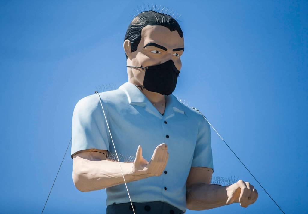 EVERETT — The 20-foot Muffler Man statue atop a downtown building is taking a stand against the virus.