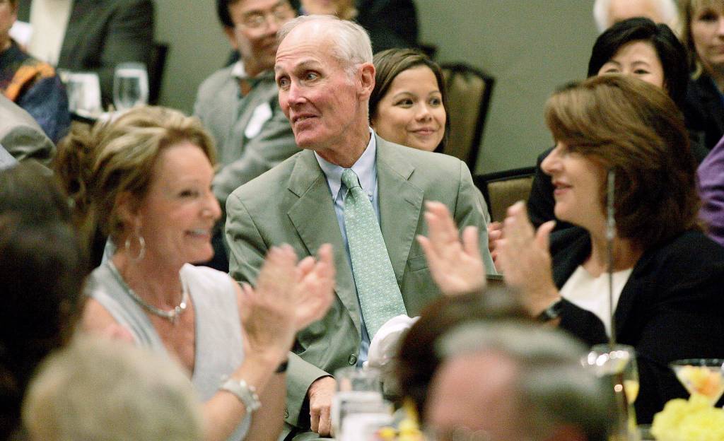 Former Republican Sen. Slade Gorton (center) is introduced at a fundraiser in Bellevue in 2006. Gorton, who served in the Legislature and as state attorney general before he became a three-term U.S. senator, has died. He was 92. (AP Photo/Ted S. Warren, File)