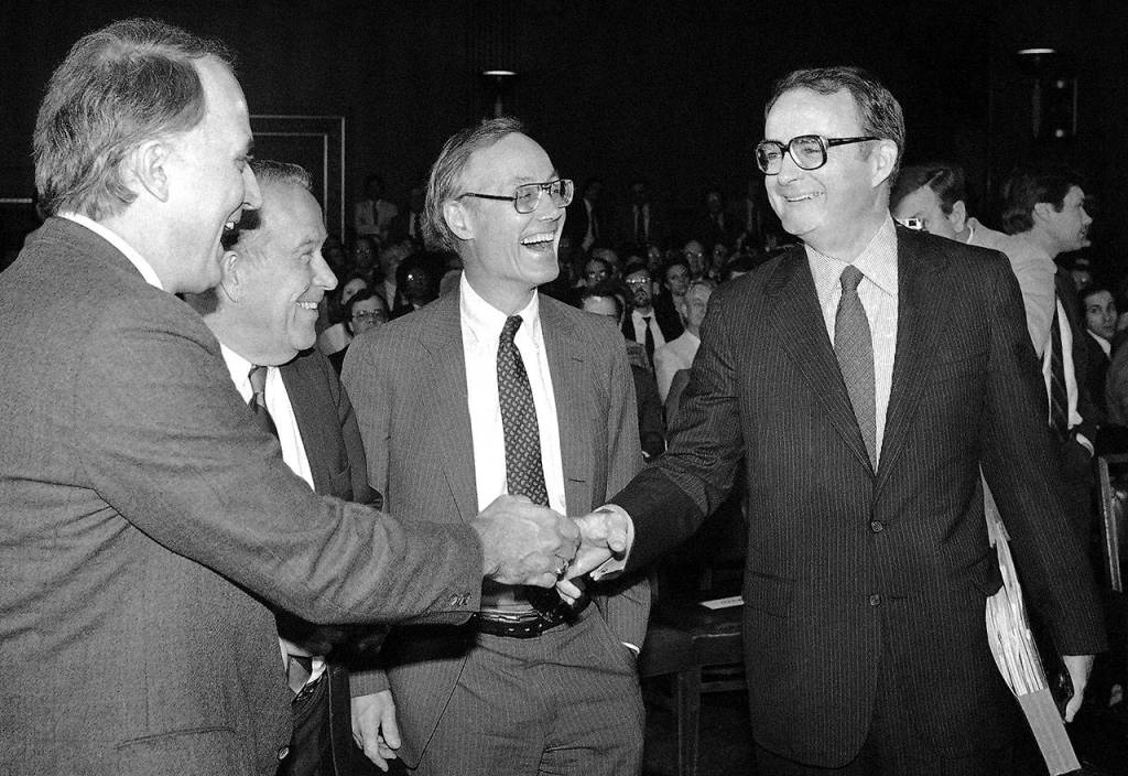 U.S. Sen. Slade Gorton (center) on Capitol Hill in Washington in 1983. He is flanked by (from left) Sen. David Durenberger of Minnesota, Sen. Henry M. Jackson of Washington and William Ruckelshaus. (AP Photo/Ira Schwarz)