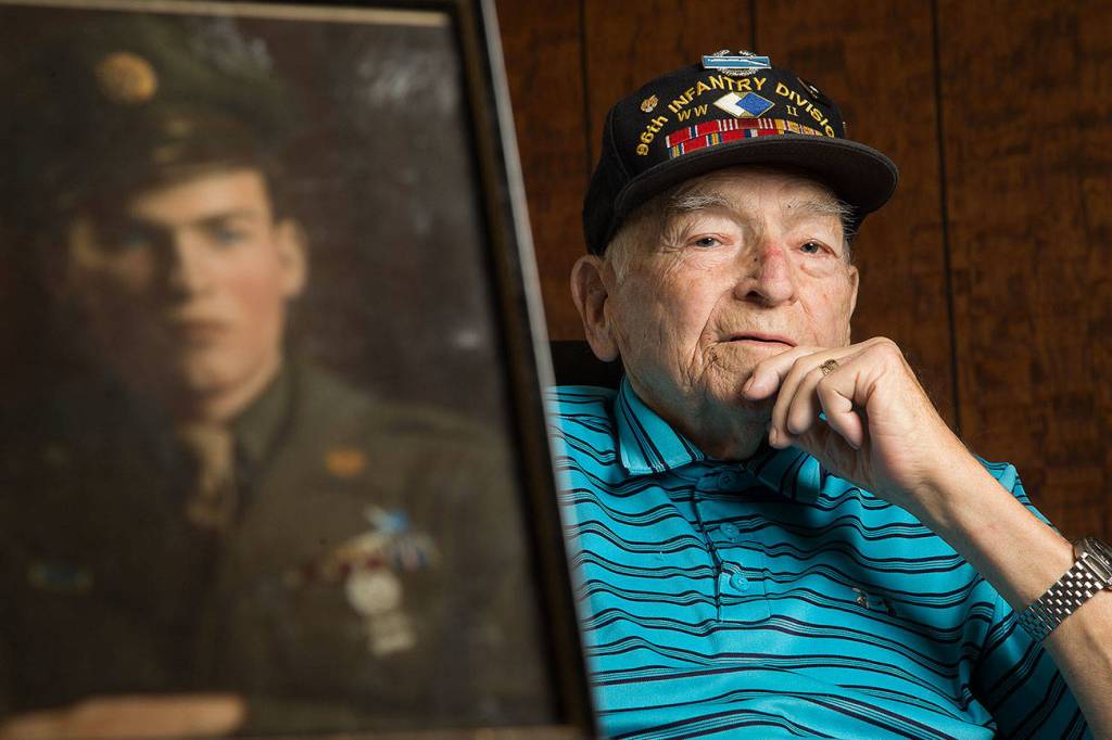 World War II veteran Farlan Dubarry, 94, talks about his time in the military, on Okinawa and then the Philippines, at his home in Marysville. A widower, Dubarry was invited to be in Hawaii this week. Before COVID-19 forced changes in plans, veterans from around the nation were to have been honored in person on the official 75th anniversary commemoration of the end of World War II. (Andy Bronson / The Herald)